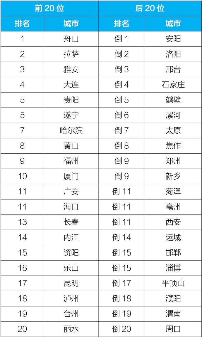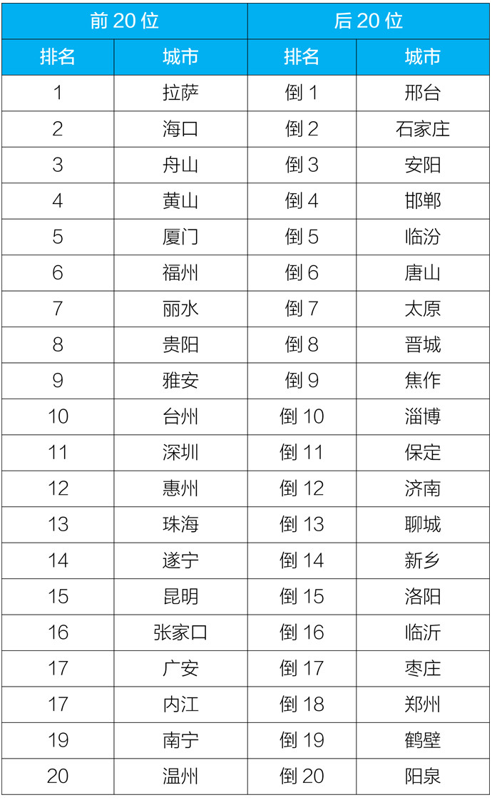 2019年11月168個重點城市排名前20位和後20位城市名單