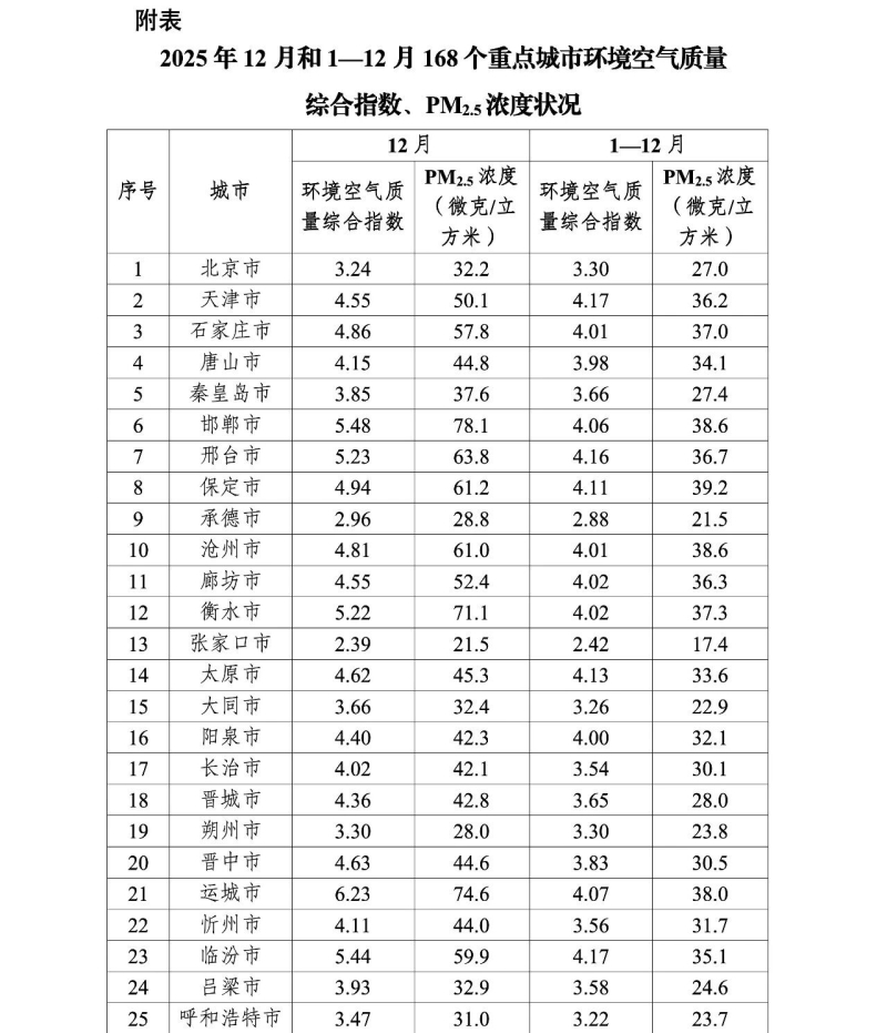 生態環境部今日向媒體公佈了2025年12月和1—12月全國環境空氣品質狀況。