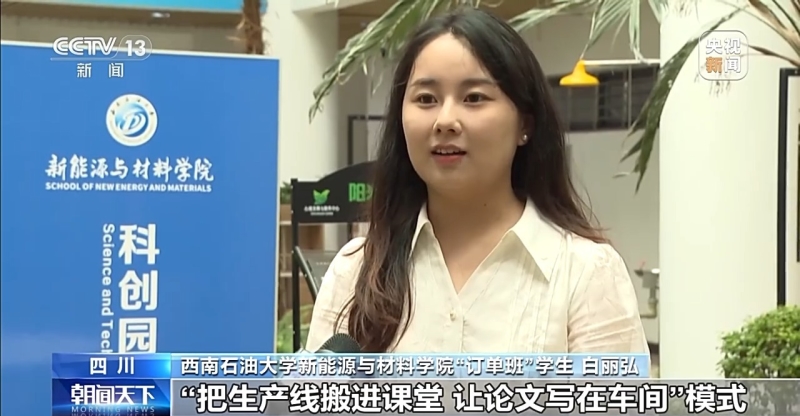 西南石油大學新能源與材料學院“訂單班”學生 白麗弘:“訂單班”通過“把生産線搬進課堂,讓論文寫在車間”的模式,讓我能夠較早進入企業實習,接觸學習到行業的尖端光伏技術。